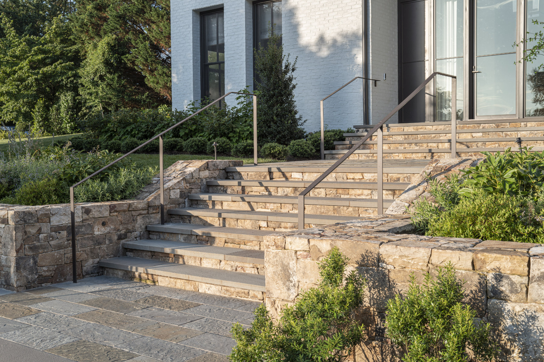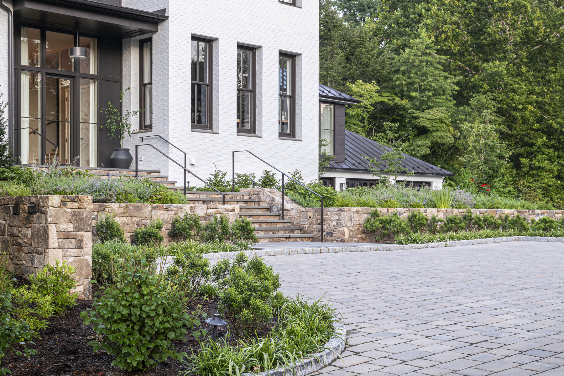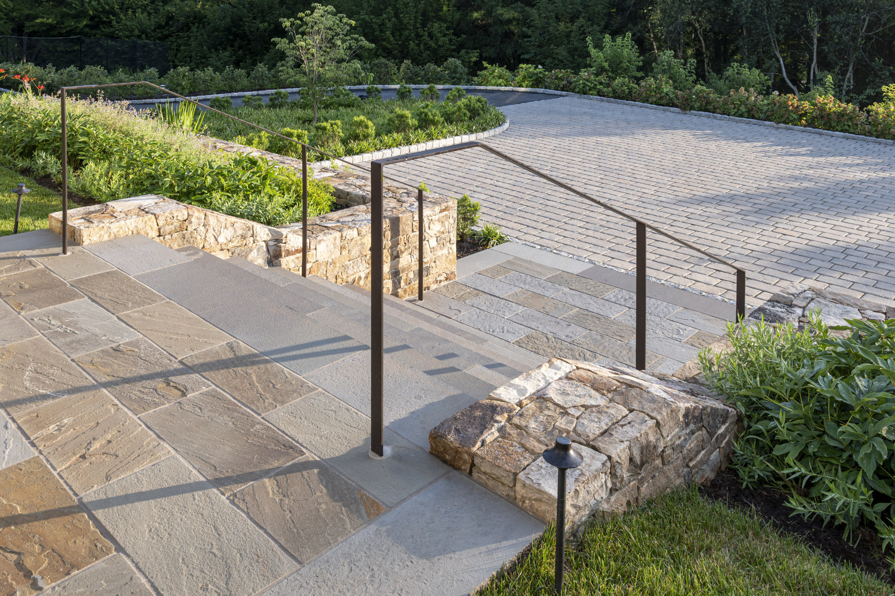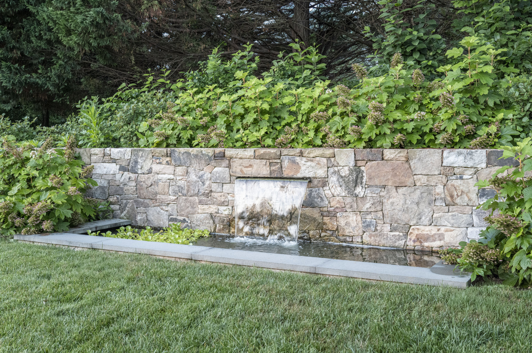 This project consisted of a beautiful combination of fieldstone site walls, stone masonry, brick masonry, masonry grill enclosure, water feature, landscape lighting, bluestone paving and steps, granite cobblestone edging and Techo-Bloc hardscape driveway pavers.