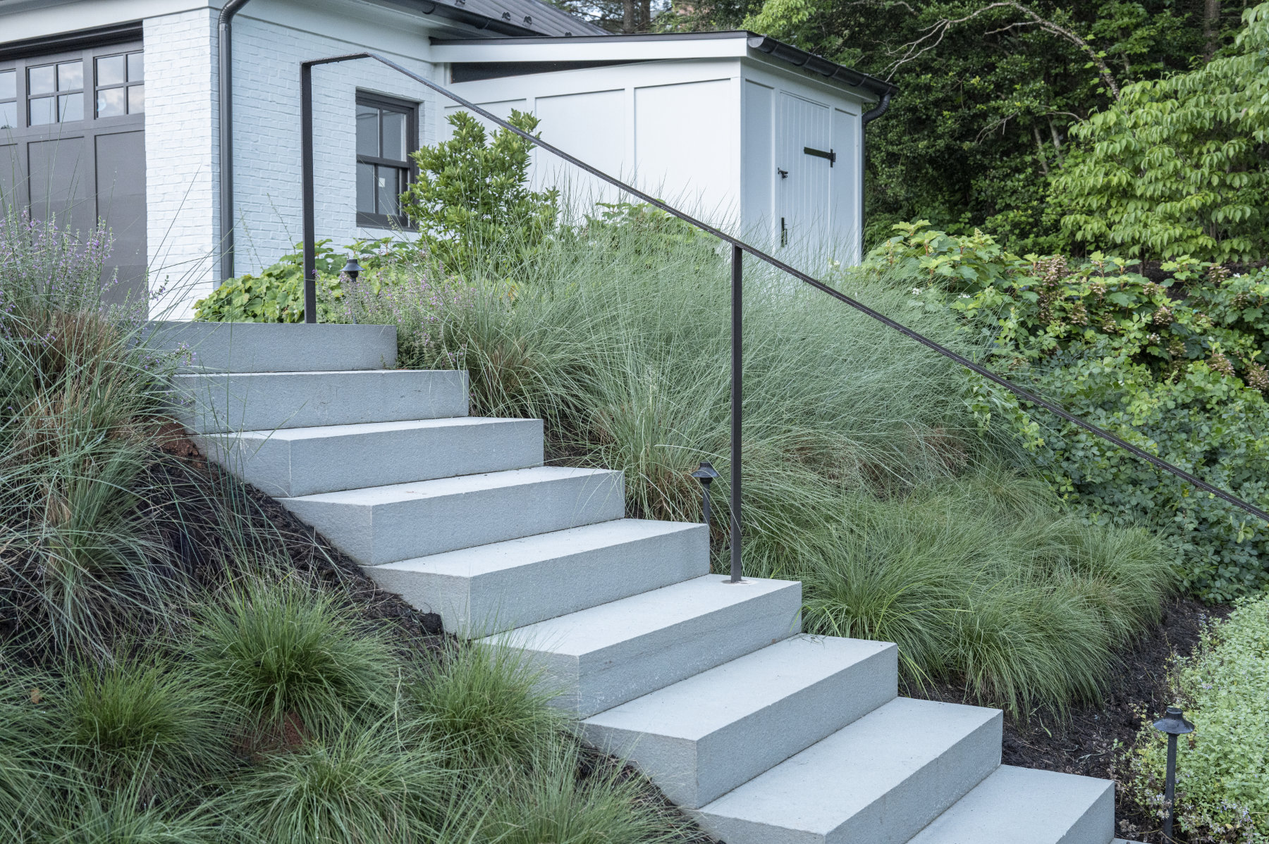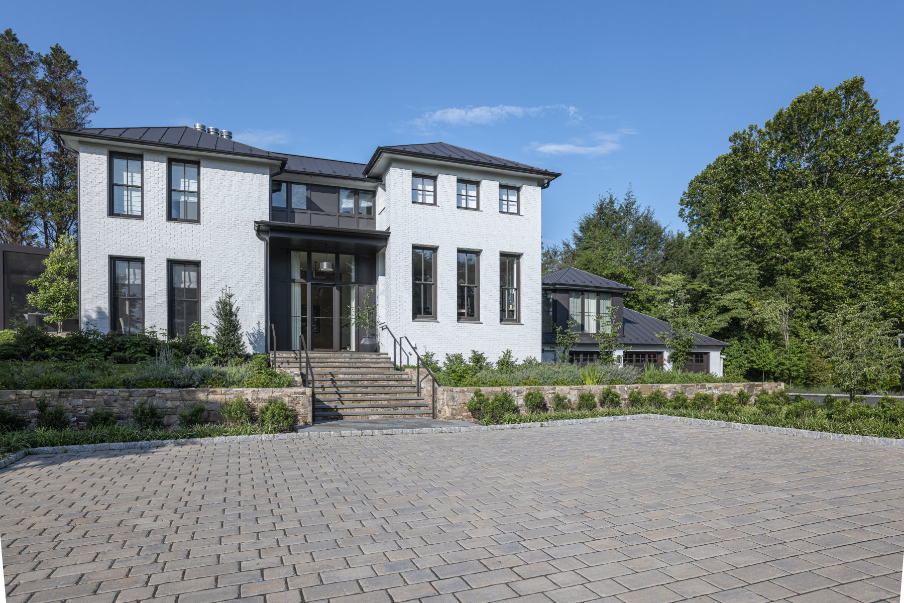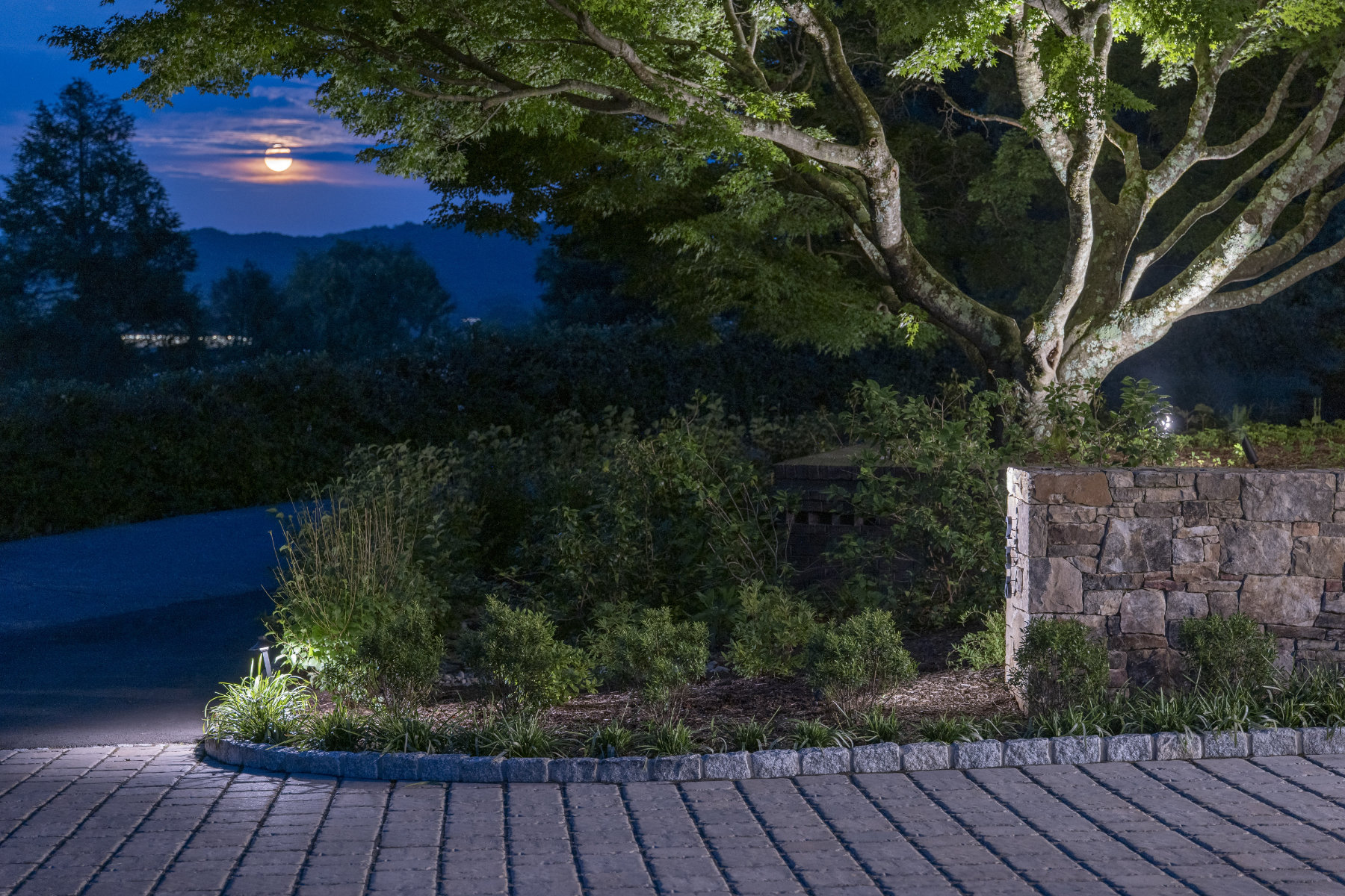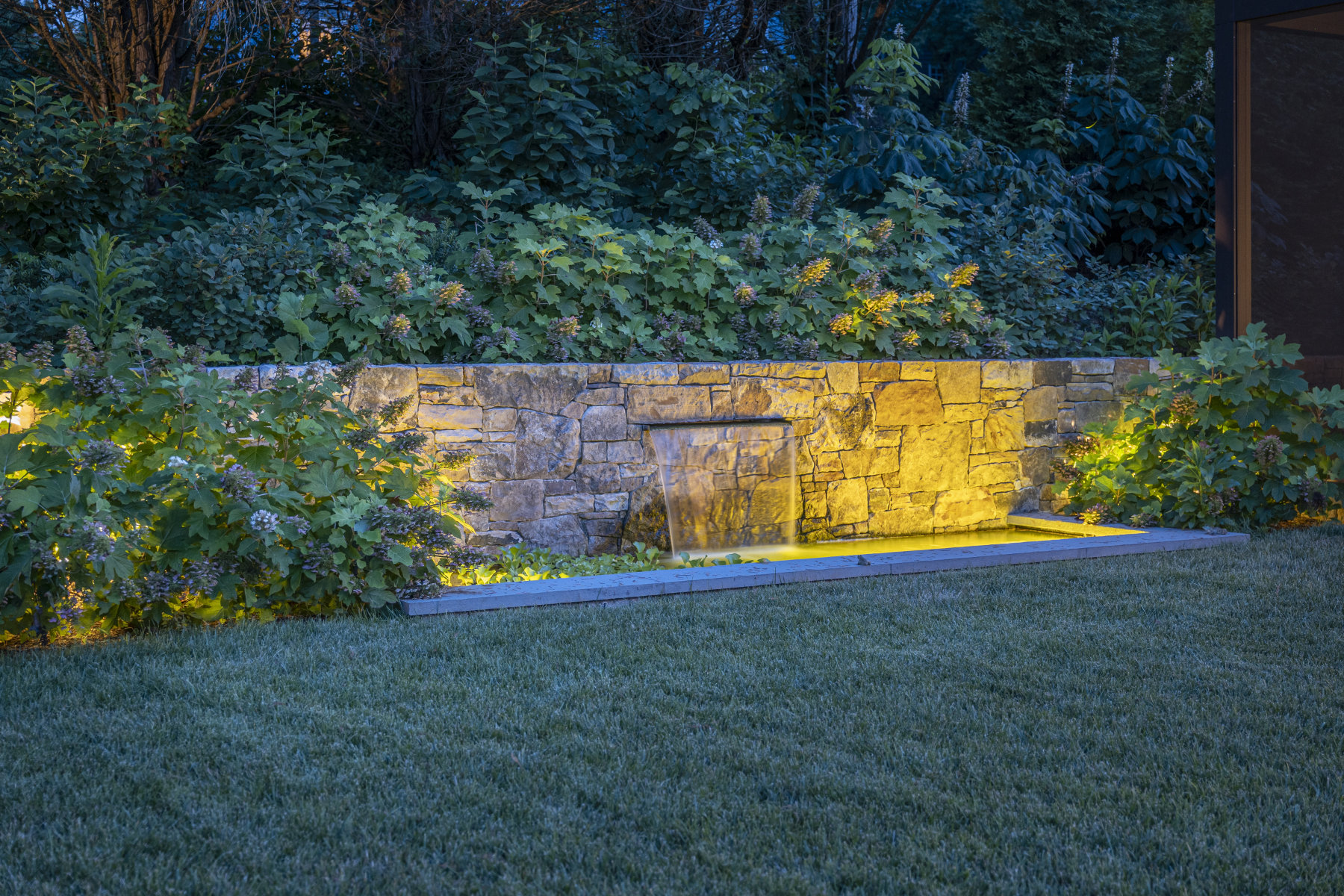 This project consisted of a beautiful combination of fieldstone site walls, stone masonry, brick masonry, masonry grill enclosure, water feature, landscape lighting, bluestone paving and steps, granite cobblestone edging and Techo-Bloc hardscape driveway pavers.